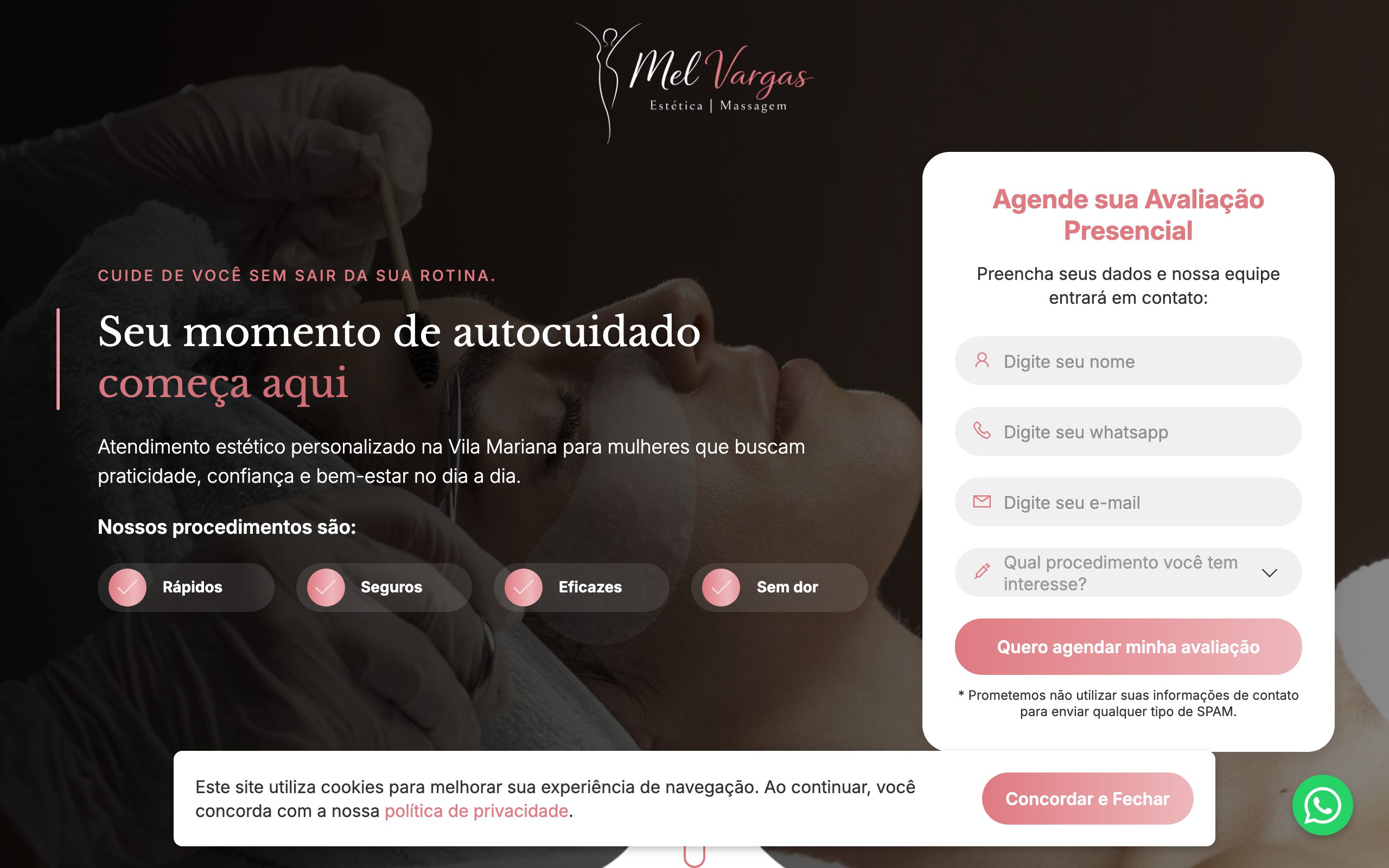 Páginas de alta conversão com copy, design, formulário e até WhatsApp embutido. Prontas para seu domínio.
